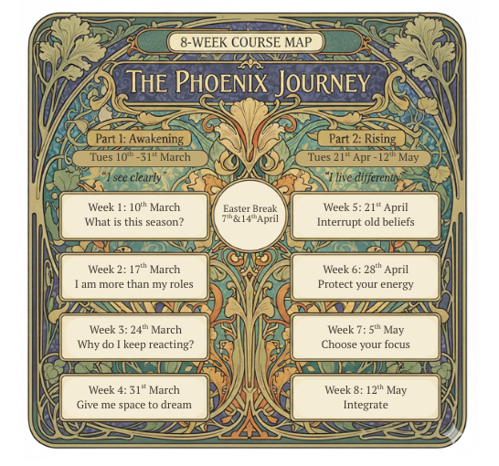 The Phoenix Season is an 8-week guided journey created for mothers in their 40s and beyond, experiencing the challenges of motherhood and maybe even perimenopause. At times feeling overwhelmed, and coasting in their careers or caring at home — women who have given so much to everyone else, and now feel the quiet pull to rediscover themselves.